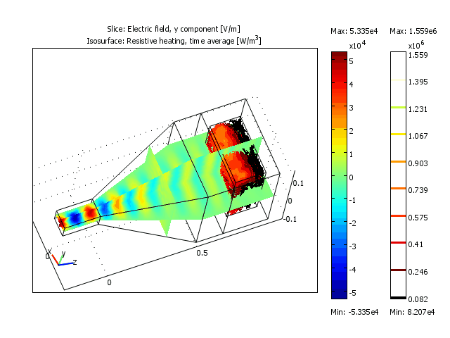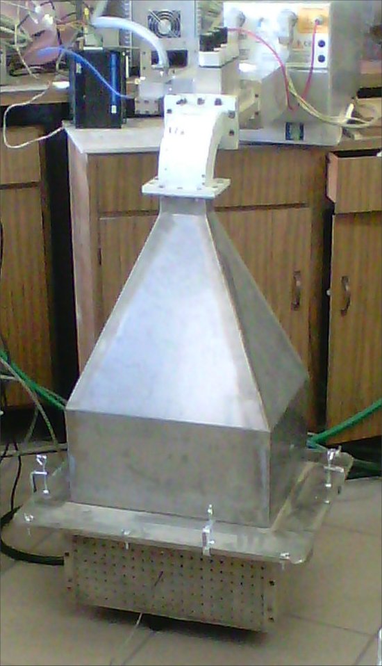 Simply a horn, feeding a multimode applicator with micro-holes to allow for rapid vapour removal, if needed. It comes with 4 ports for temperature measurements. horn applicator during testing