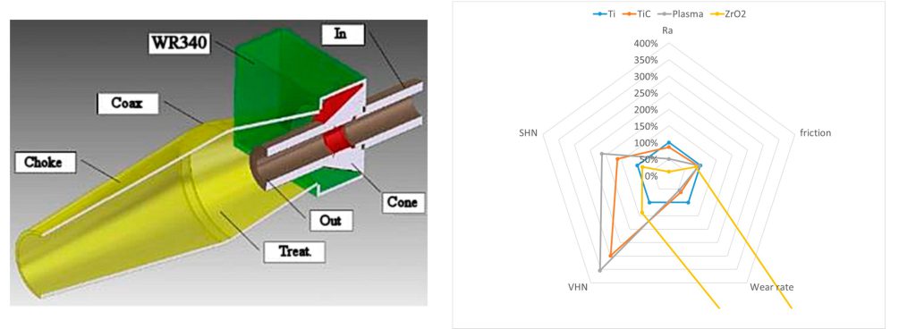 Grade 37 titanium is widely used in racing applications thanks to its oxidation resistance up to 650 °C, but it suffers from poor wear and fretting resistance, especially at high temperature. In this paper, different surface modification techniques, namely, carburizing, coating by PVD-ZrO2 and a novel microwave plasma oxy-carburizing treatment, are investigated in terms of hardness, wear resistance and scratch hardness, compared to the untreated substrate. Numerical simulation allowed optimization of the design of the microwave plasma source, which operated at 2.45 GHz at atmospheric pressure. The proposed microwave plasma oxy-carburizing treatment is localized and can serve to improve the tribological properties of selected regions of the sample; compared to untreated Grade 37 titanium, the oxy-carburized layer presents a decrease in the wear rate at 450 °C against alumina of 54% and an increase in scratch hardness of more than three times.