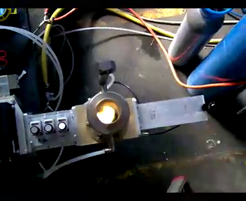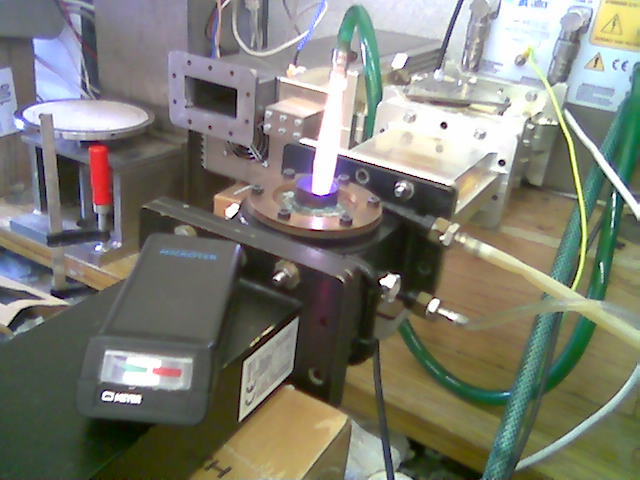 Some of our atmospheric plasma torches. The small one has been used for thermochemical processing of metals, surface modification of plastics, wire-rod descaling and in powder metallurgy. The large one, externallly water cooled and shown in a top view, for post-processing of exhaust gases.