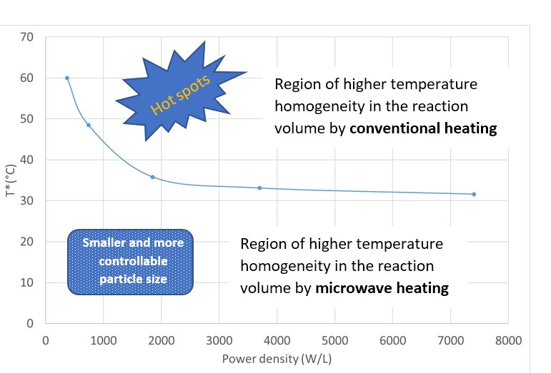 Numerical simulation is used to compare the temperature distribution existing during microwave or conventional heating by hot oil bath of a reaction volume. The simulation is applied to the sol-gel synthesis of TiO2 nanopowders, considering temperature dependent materials parameters. A WR340-based single mode applicator operating at 2.45 GHz is considered, with a cylindrical load positioned in regions of predominant electric field. A temperature homogeneity index, defined as the ratio between the average temperature and its standard deviation at a certain time, is used to compare homogeneity of conventional and microwave heating at different power densities, from 370 to 7400 W/L. Based on that comparison, a selection chart of the more homogenous heating process as a function of power density and average temperature of the reaction volume is defined and can be used to select the experimental conditions expected to lead to a more or less homogeneous particle size of the products.
