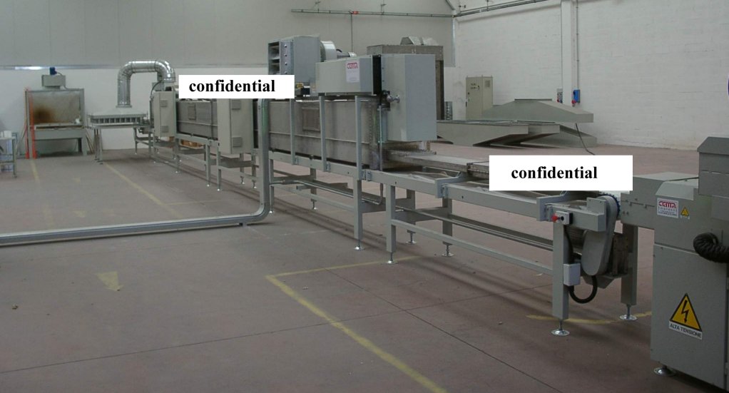 A microwave + hot air tunnel, originally meant to process wooden materials and drying paints or glue. Waveguides have the possibility to change their inclination with respect to the conveying belt, so that they interact with the load under its Brewster’s angle. Equipped with 7 magnetrons, 2450 MHz and two long chokes for continous processing.